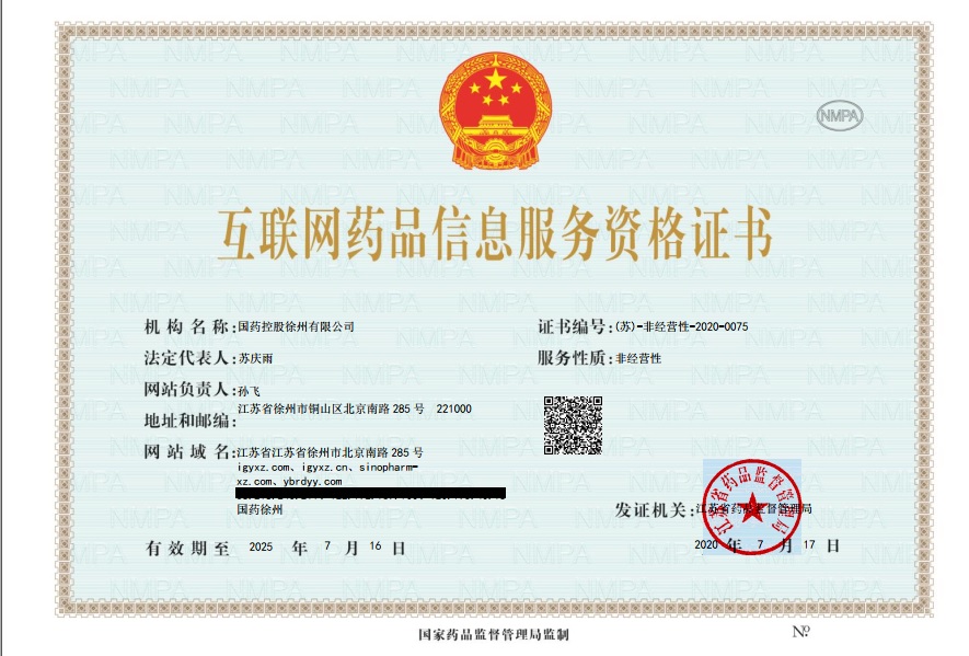 0516-8010-1098 江蘇省徐州市高新技術開發(fā)區 北京南路283號萬泰廣場1號樓7-13層 互聯網藥品信息服務資格證書